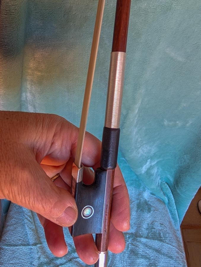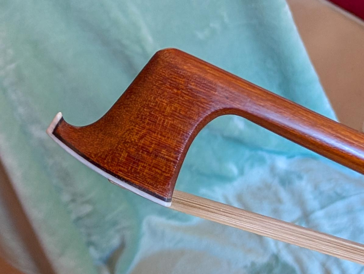 A really beautifully balanced bow, with a strong but flexible stick. It is a pleasure to use and it bounces perfectly. A lot of sound with little effort - the bow does the work for you! It has always had tinsel lapping. If this is changed to silver it becomes too heavy and unbalanced. I am selling due to retirement and having stopped playing.