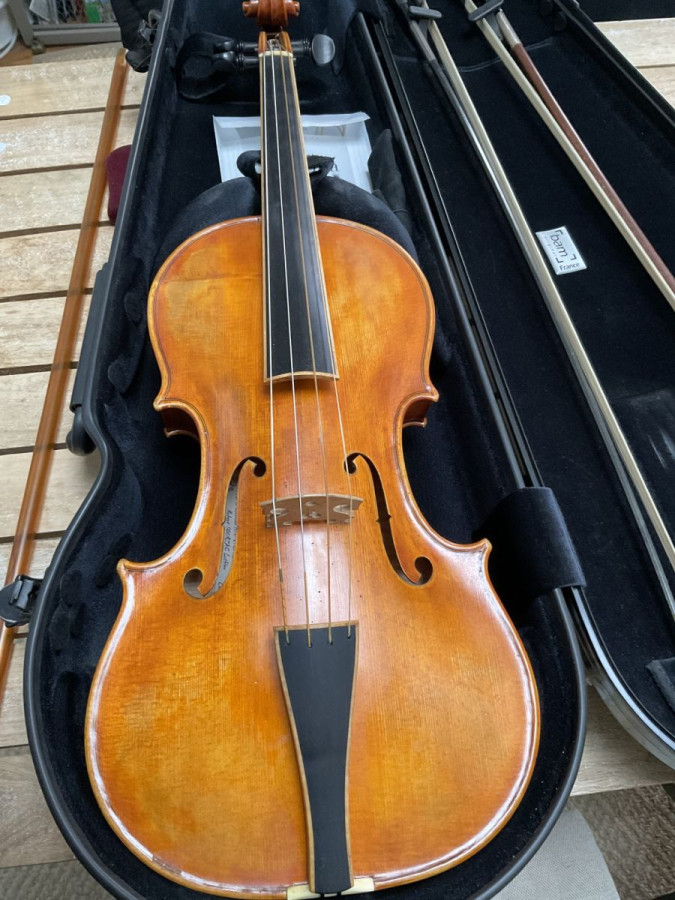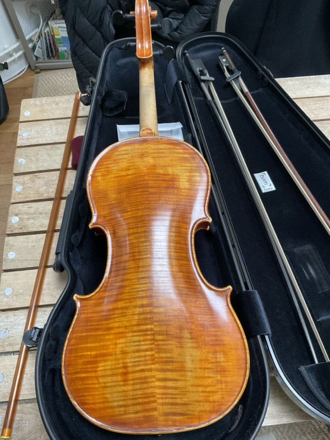 Vernis à l'huile et ambre, signé par l'étiquette collée à l'intérieur.