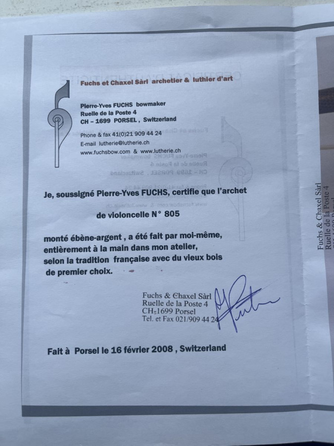 Cello bow by Pierre Yves Fuchs. Great conditions.