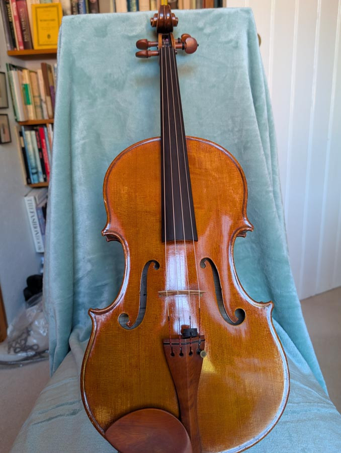 It is bright but never brash and has a huge sound. It is very good in an orchestral setting and easy to hear under the ear. The tone across all the strings is very even and the A string is not nasal. The C is meaty! I use Pirastro Obligato strings on it as they seem to suit it well.
