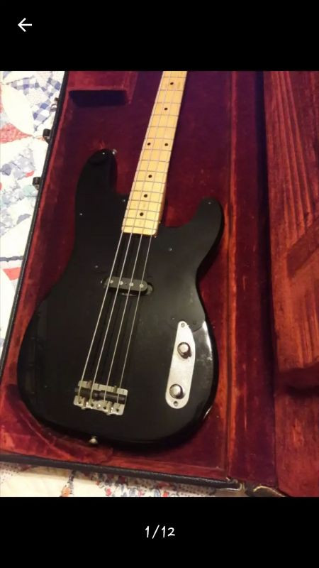 4 string 1953 Fender Precision Bass Guitar that has a black body with a black pickguard, a single coil pickup, and a chrome control plate loaded with chrome volume & toneknobs. The chrome bridge has the serial #0208 and the words FENDER PATENT inscribed upon it. The bolt on maple neck has 20 frets, and the headstock has 4 chrome tuning keys with the Fender logo and Precision Bass label just below the tuning keys. The Original pick-up, pick-up & bridge covers, and potentiometers are kept in the black hard-shell case along with the cammo pattern shoulder strap. There’s a dent in the body close to the top strap button and a couple of slight dings down by the bridge. Serial # 0208.