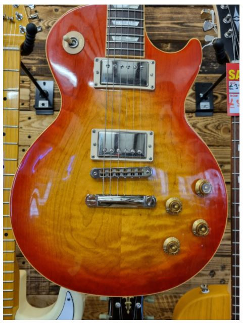 Cherry Burst with a distinctive circular maple ring to the left of the maple top. Also a scratch inside the cut away.