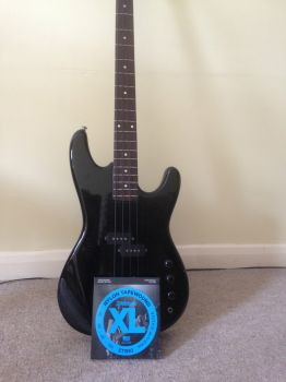 Black body bass guitar with black nylon tape wound strings.