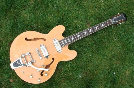 Epiphone Casino, Natural Finish, Modified with Grover tuners and Bigsby. Small chip on the back of headstock under top right tuner.