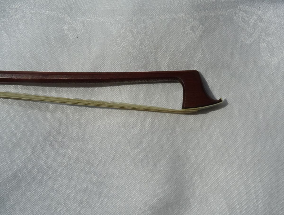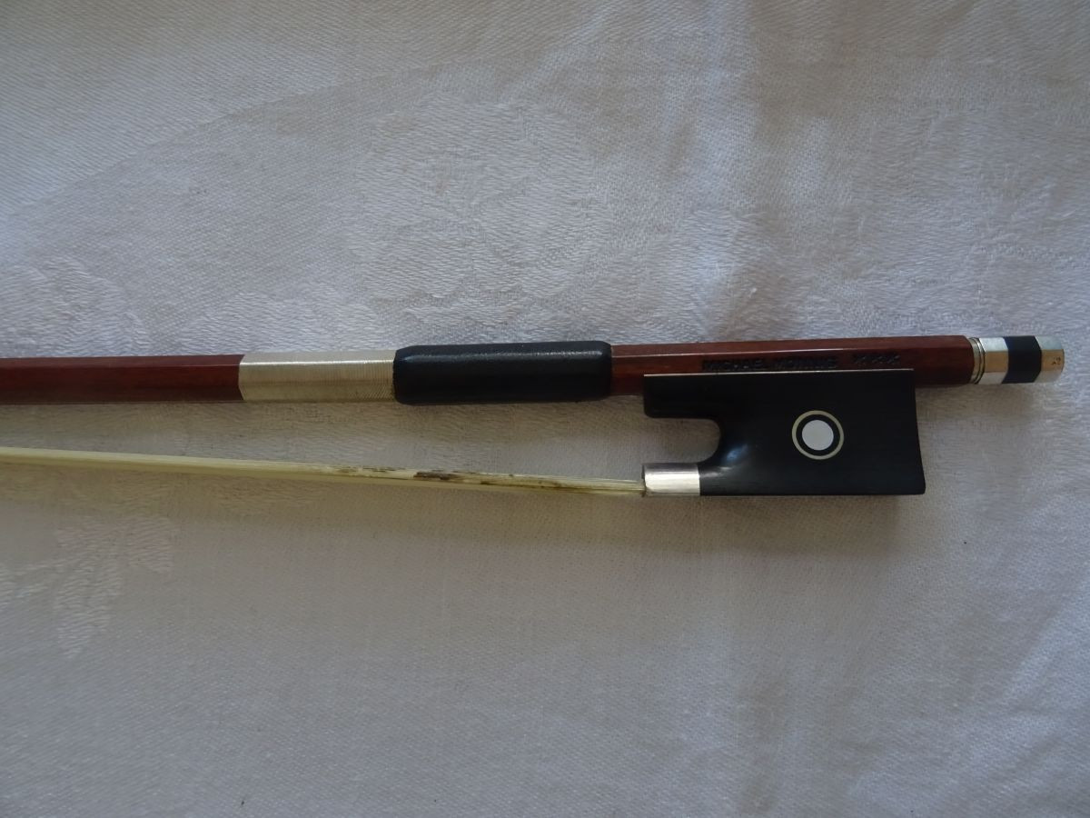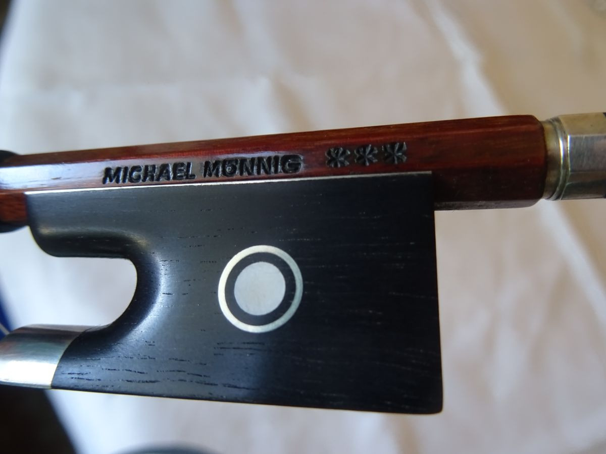 Violin bow stamped Michael Monnig with 3 stars. Octagonel pernambuco stick with silver mounted ebony frog. Weight is 62gr. The bow is in extremely good condition.
