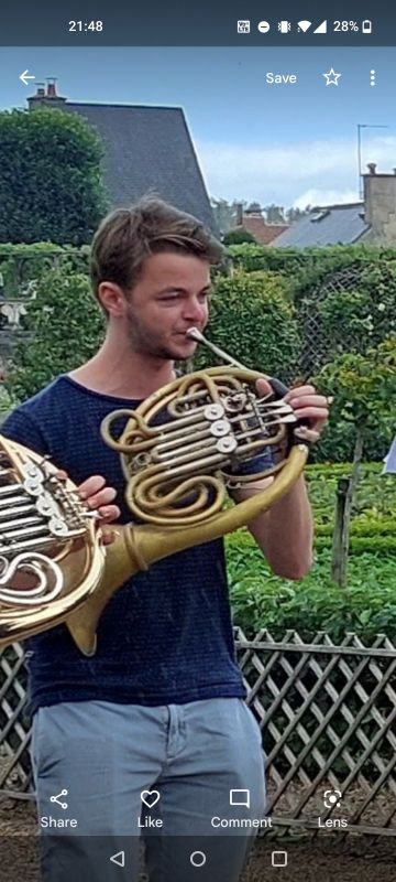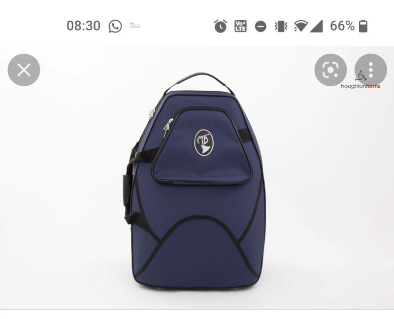 The horn is non shiny, about 30 years old, in good condition. It has a leather handpiece, and resides in the darkblue case. The case has lots of stickers.