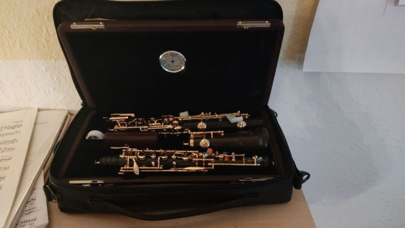 Oboe "Ludwig Frank" with golden mechanic in black leather case.