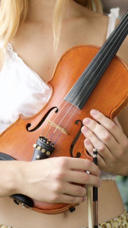 Violin, Orange Varnish, White Circles below tuners, Scratch on Back