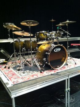 PDP X7 SERIES 5 PC. DRUMSET W/ ZILDJIAN CUSTOM A CYMBALS (HI-HATS, 16" AND 18" CRASHES, 20" RIDE), (1) MEINL 10" DARK CHINA SPLASH, (1) SABIAN 10" HAND-HAMMERED SPLASH, LP TAMBOURINE (WHITE), LP COWBELL (BLACK), LP WOODBLOCK (GREEN), PRECISION CUSTOM SNARE, TAMA KICK/HI-HAT PEDALS, PDP CYMBAL STANDS, (1) STAGG CYMBAL BELL, (1) WUHAN CHINA CYMBAL.