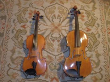 It is the viola on the right. It is an IESTA with 41 cm and was bought to Judith Bauer Luthier Violin Maker. Case also contained a german bow with a round rod, vision strings, two cleaning cloths (red and yellow). The case was rectangular and dark blue both inside and outside. Thank you for reading and please contact me if you have any information.