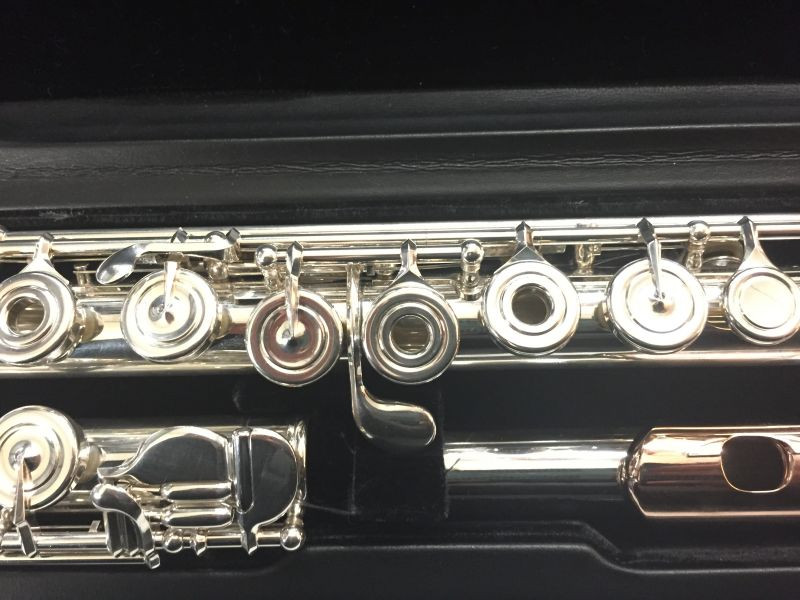 Sterling silver Miyazawa flute, 402 series, heavy wall body, French arm open hole keys, offset G, B foot joint. Serial number 89590.