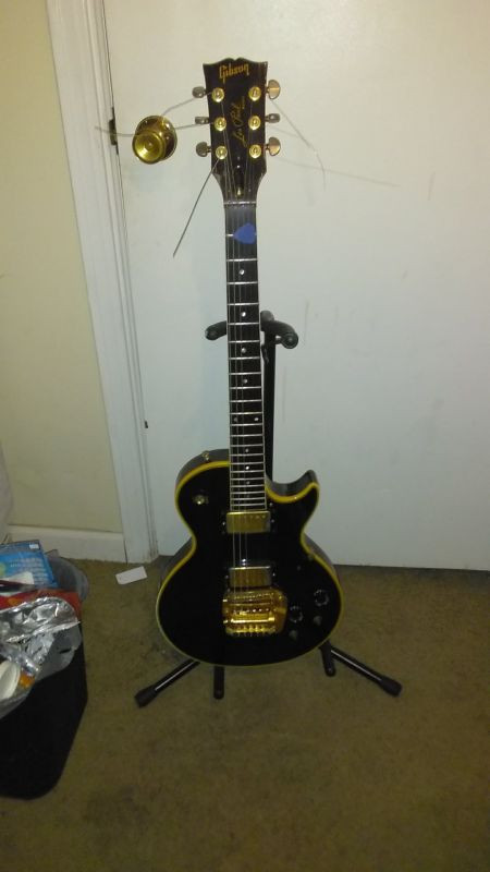 See pictures. Black Gibson Les Paul custom. Gold hardware. Missing parts.
