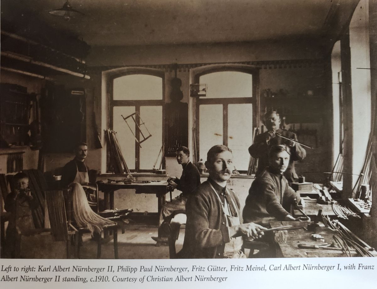 Friedrich was a student of W. A. PFRETZSCHNER, and he worked with Franz A. NÜRNBERGER II in Markneukirchen for many years (cf. photo of MEINEL in the Nürnberger workshop; photo courtesy of Christian A. Nürnberger). From 1918, he successfully ran his own workshop. MEINEL’s bows are artistically made; the NÜRNBERGER influence is recognisable in the shape of his frogs and heads.