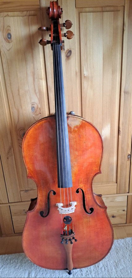 Das Angebot beinhaltet ein 4/4 Cello, in sehr gutem Zustand, sofort spielfertig. Es weist nach Begutachtung eines Geigenbauers keinerlei Beschädigungen auf und hat u.a. einen sehr schön gemaserten Boden. Der Ton ist kräftig.