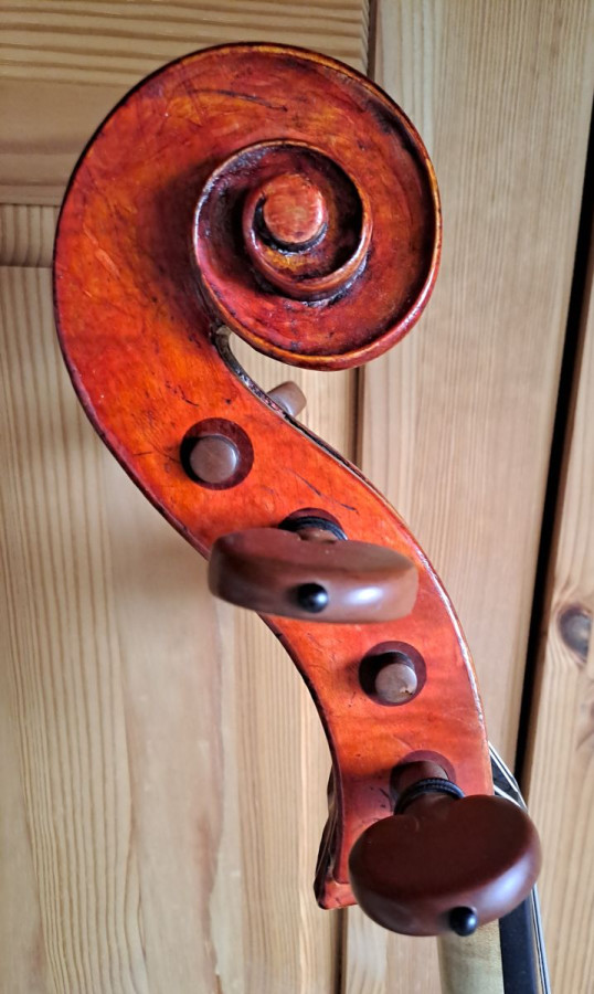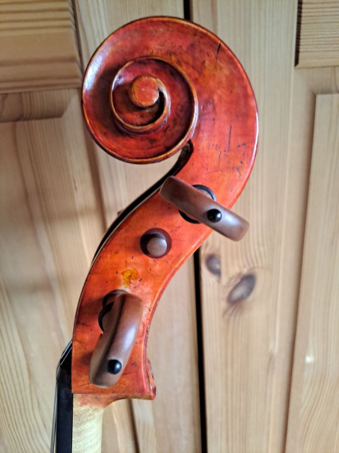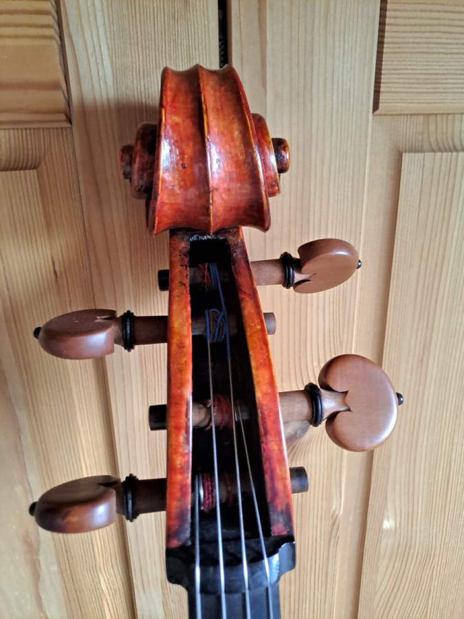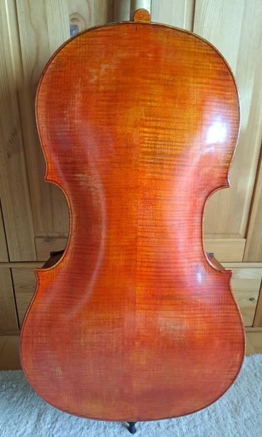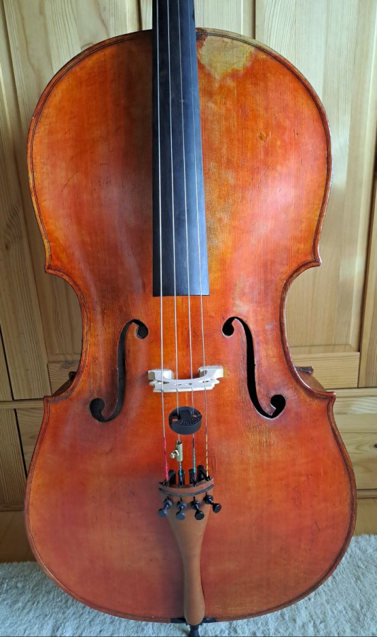 Laut Vorbesitzer war dieses Instrument das Dienstcello eines Cellisten beim Theater an der Wien, später Gärtnerplatz-Theater. Es ist in Kopiermanier gefertigt und hat daher, wie einige originale alte Meisterinstrumente, einen etwas breiteren Korpus (36,3 / 25,5 / 44,3 cm). Daher passt es u.U. nicht in die meisten handelsüblichen Kästen hinein. Ein passender Kasten gehört daher zum Angebot.