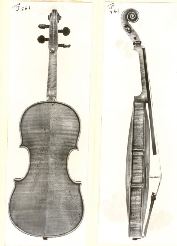 A violin with golden brown varnish. The top is 2 piece spruce of medium grain, the back is 2 piece maple, warm flames of even grain with matching ribs and scroll. Measurements: Body Length 356mm / Upper bout 166.5mm / Middle bout 112mm / Lower bout 202mm