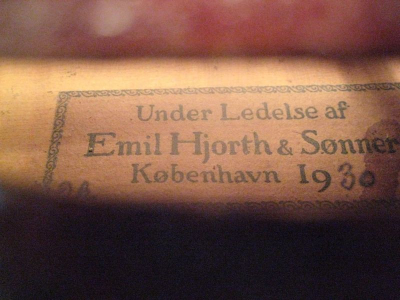 The violin is dark red/orange and built by Emil Hjorth & Sønner - inside the violinen it says “under ledelse af Emil Hjorth og sønner København 1930”.
