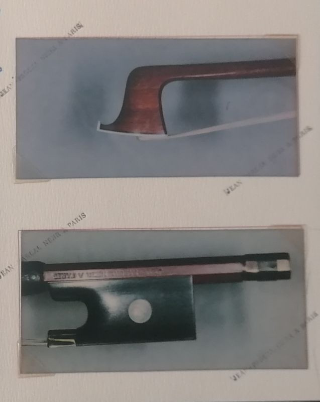 C'est un archet de 1995 en pernambouc, qui est facilement reconnaissable car il lui manque la plaque rectangulaire en nacre en dessous de la hausse (c'est noir et vide), et le bout de vis en nacre est abîmé.