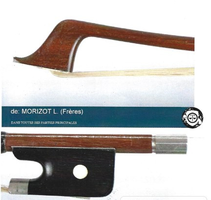 Morizot Freres Cello Bow with cloth bandaid around stick near between frog and grip, in single black Protec bow case.