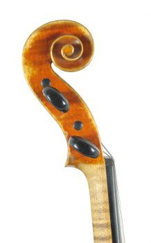 Stolen November 2013 in Konstanz, Germany: French violin by Leon Mougenot, 1912, original label, golden-brown oil varnish with several characteristic marks on table, small repair at upper right soundhole eye. LOB 35.4 cm.<br>