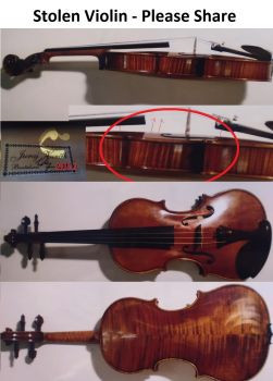 It was stolen in a black oblong case with canvas cover and back straps made by "Padi" and had a german and a french bow in the case.