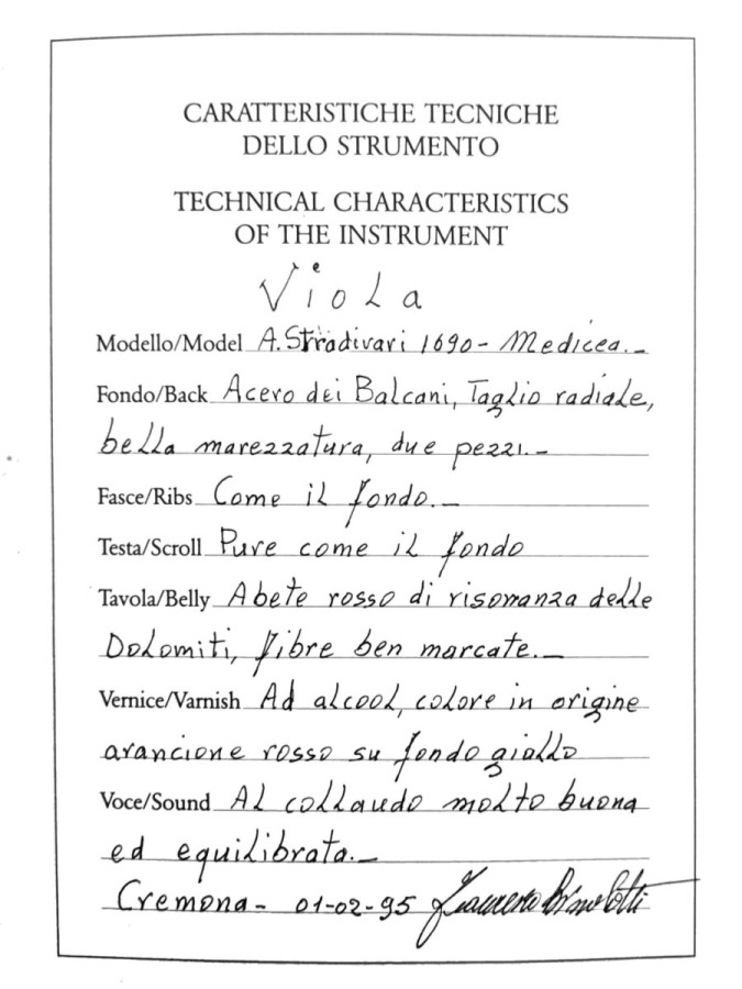 Amazing viola by Francesco Bissolotti (the father), Cremona, 1993. In perfect condition, beautiful and powerful sound; made with Dolomite firsize 42, certificate of authenticity.
