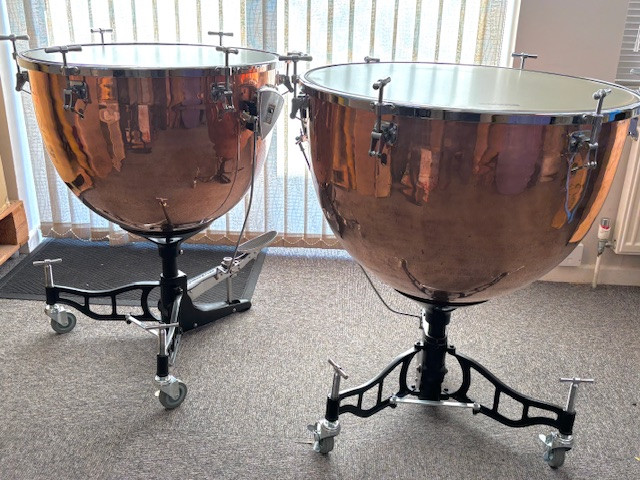 Restored pair of copper Slingerland 'Universal' type timpani. 25" and 28" with Premier style pedal. Formerly belonging to the late Michael Skinner, (Royal Opera House) these are now looking for a new home, with all proceeds going to his family.