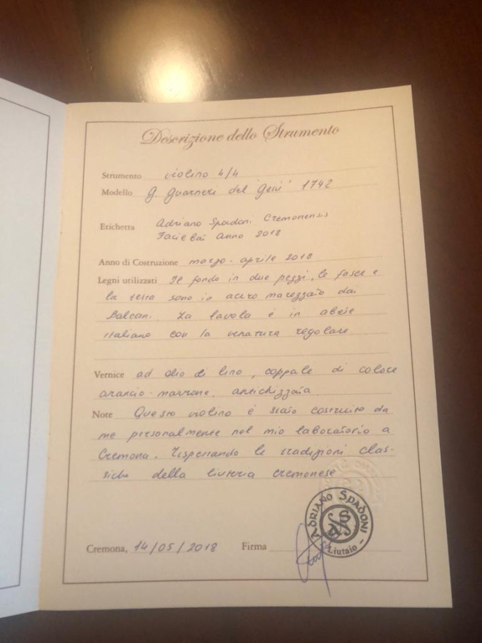 A beautiful violin by the maker Adriano Spadoni built in 2018.
