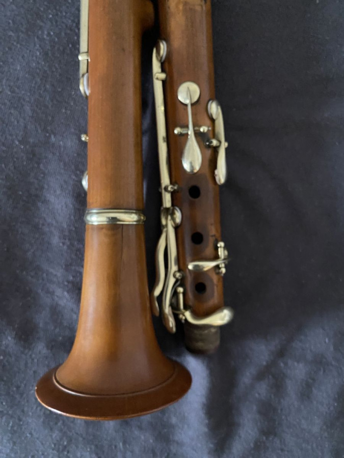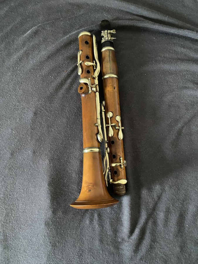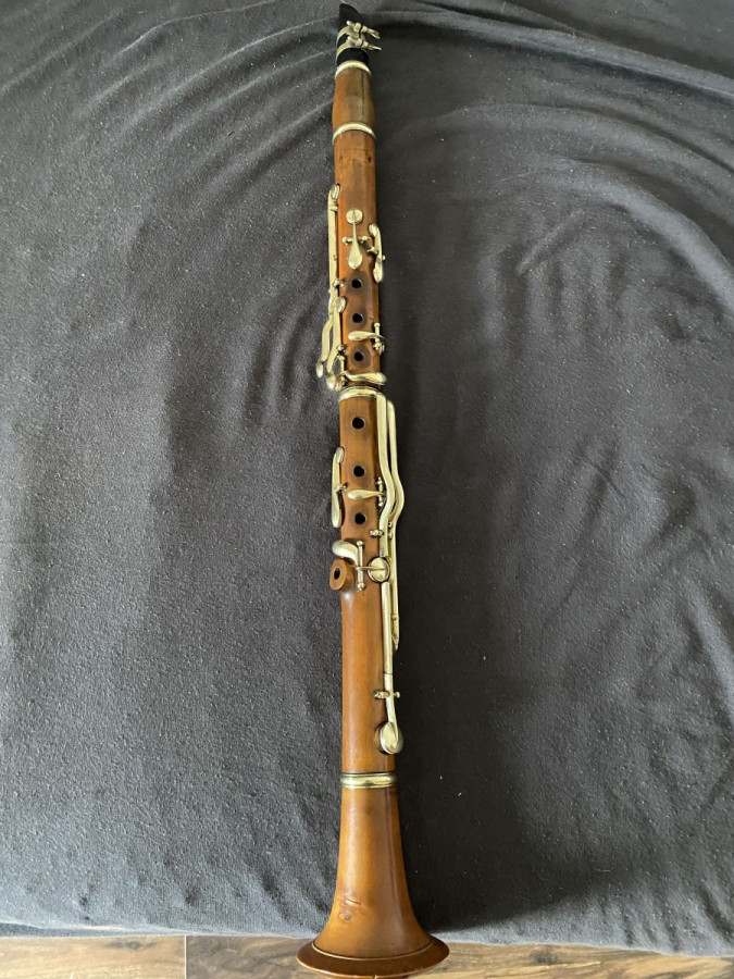 For sale: two antique clarinets 19th-century clarinet, probably of German origin, made of boxwood – 12 keys, approximately 60 cm in length without the mouthpiece. It has minor hairline cracks; the wood is well preserved and the keys are in good condition considering the age. Likely pitched in B♭ or C, or possibly an older historical pitch. Sold in original condition; servicing (new pads, mechanical check) will likely be required. Antique A clarinet, probably C. Klein Mainz – 15 keys, approximately 605 mm without mouthpiece, 675 mm with mouthpiece. The lower right-hand keys have rollers, a feature rarely seen today. It has minor cracks and scratches; the keys are in very good condition. Sold without case, original condition, will likely require servicing. Both instruments are suitable for collectors or restoration. More information and additional photos are available upon request.