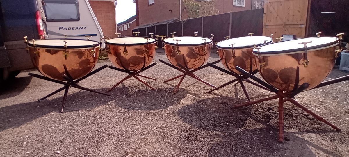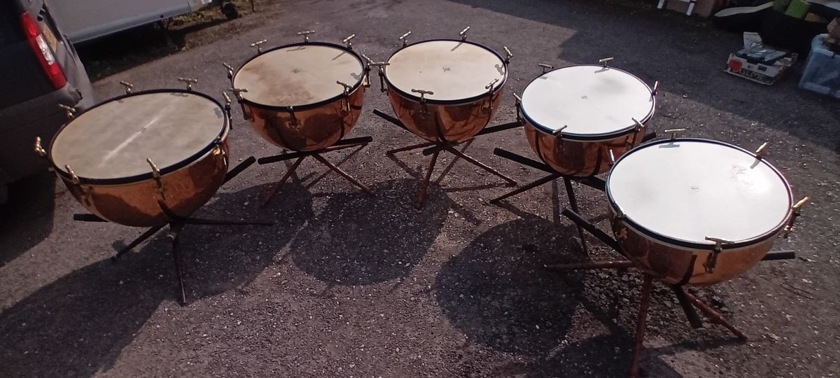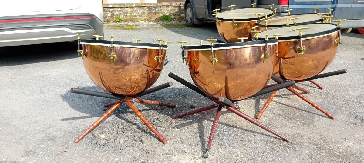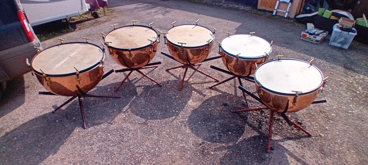 The smallest 2 are George Potter Timpani, Aldershot, dated by Peter Woods of Henry Potter & Co Aldershot as circa 1870. The other 3 were hand made by Mr Woods at Henry Potters & Co in 2015 to match the original pair in shape and proportions.