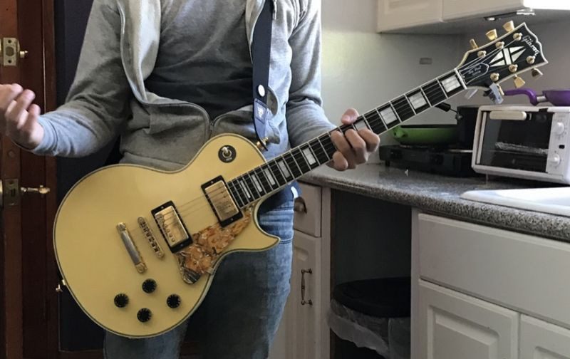 beautiful aged white les paul serial number 81060519 had custom colored pick guard and an original john lennon for jesus pin on the strap. lost in NYC at pianos march 24 2018