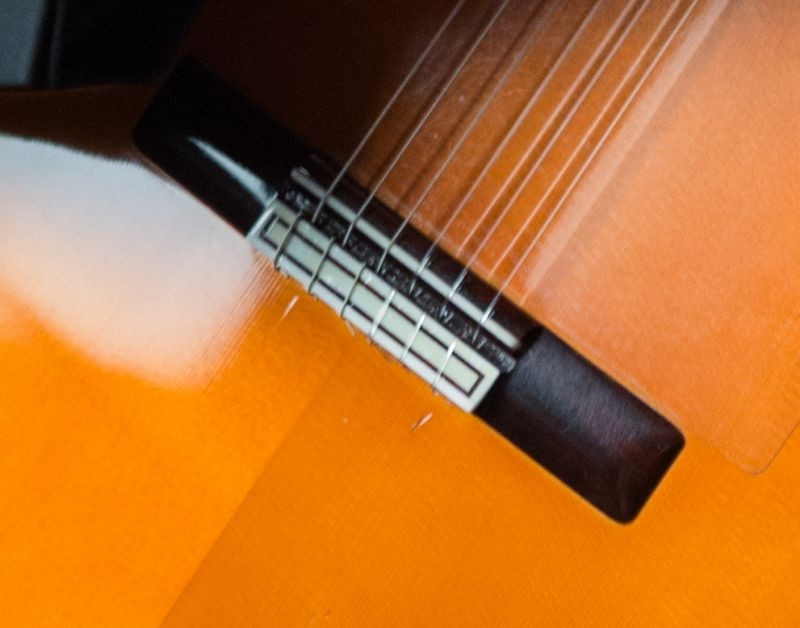 Légèrement endommagée derrière le chevalet : enfoncements suite aux cordes éclatées à la hauteur de E1 et A5
