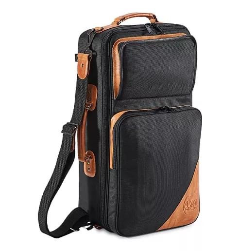 Gard black and brown triple trumpet case with black waterproof rain cover on it. Brown leather luggage tag with my details and silver "what would yuja wear" sticker on it.