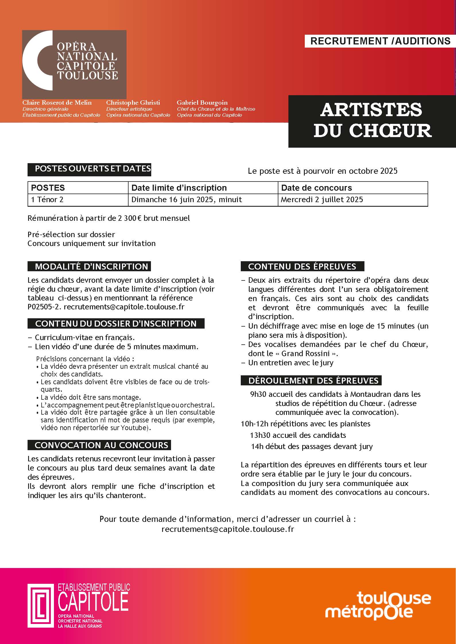 Les candidats devront envoyer un dossier complet à la régie du choeur, avant la date limite d’inscription (voir tableau ci-dessus) en mentionnant la référence P02505-2. recrutements@capitole.toulouse.fr
