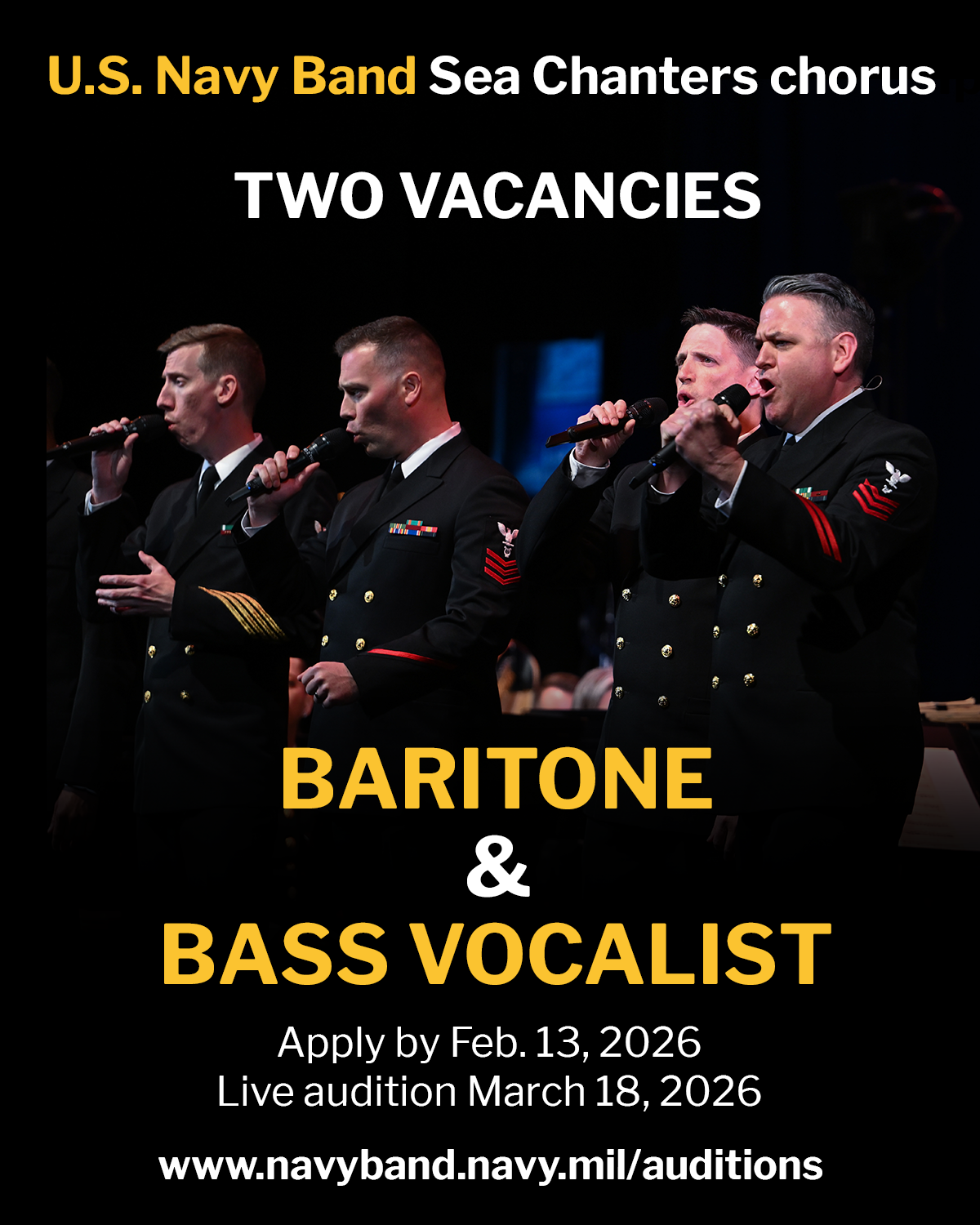 The United States Navy Band announces an immediate vacancy for Baritone Vocalist in the Sea Chanters Chorus. The live preliminary audition will begin on Wednesday, March 18, 2026 in Washington, D.C. The semifinal and final round will take place on Thursday, March 19, 2026.