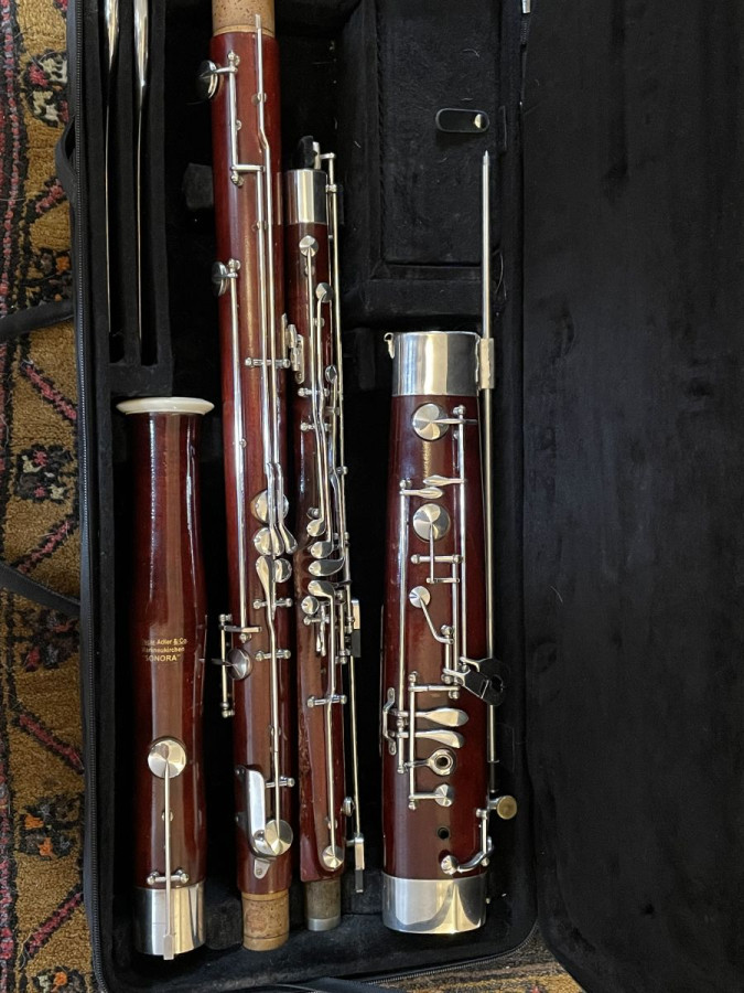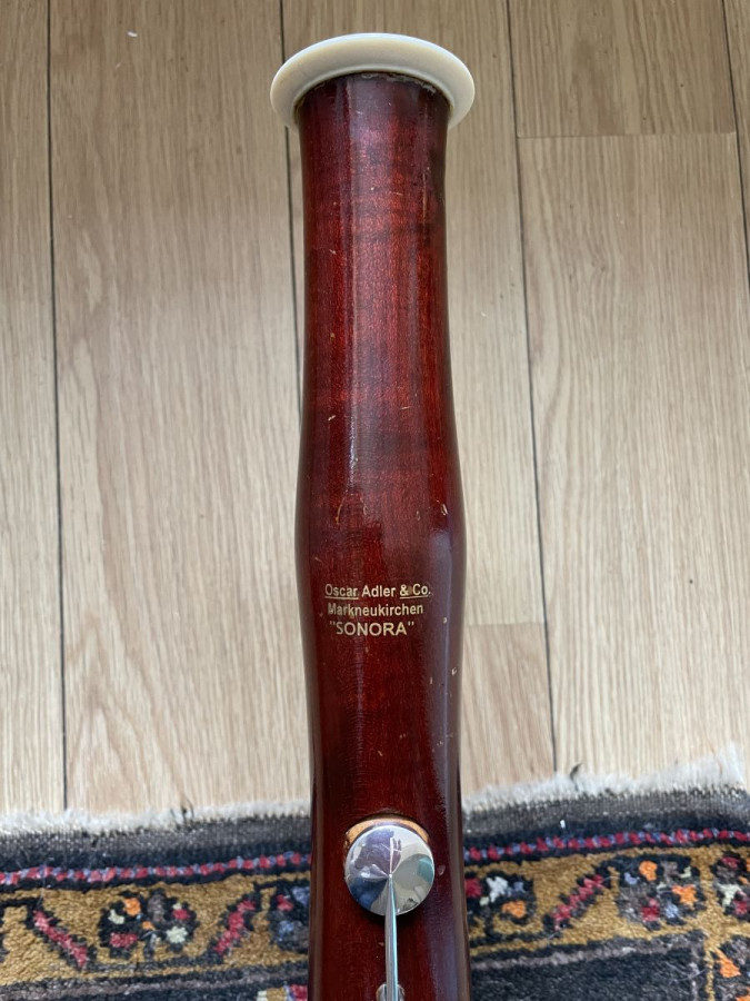 Comes with floor spike, spike stand to protect your floor, 3 new Golden Reeds, reed box, 2 crooks no 2 and no 3, pull-through cleaners and carry bag. It has a complete set of keys, suitable for professional or semi-professional playing. The body shows a few signs of wear, but the mechanisms and sound are all of the highest quality.
