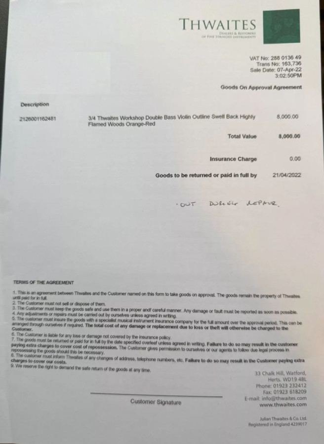 3/4 size Thwaites Workshop Double bass, with Violin Outline and Swell Back. Beautiful looking instrument with Highly Flamed Woods in Orange-Red, Solid Maple Wood throughout. Recent professional setup by Laurence Dixon including new Evah Pirrazi strings. The low action and low tension strings deliver a smooth playing experience.