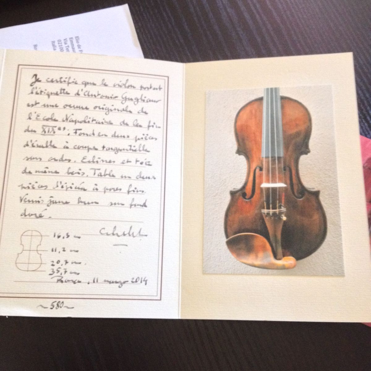 Certification: Certificato del liutaio Claude Lebet