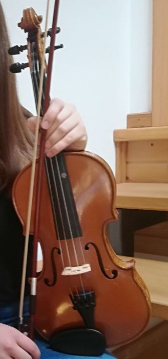 Die Geige wurde nach einem Modelll von Antonio Stradivari vom Geigenbaumeister Lüdtke gebaut. Sie hat Schwarze Wirbel und auch der Kinnhalter ist schwarz. Auf der Vorderdeite hat sie einige Macken. Es gibt 4 Feinstimmer (auch schwarz). Die Geige ist Braun.