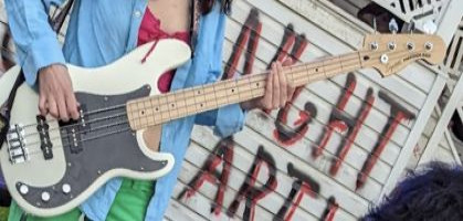 Was white with a black pickguard and I think maple (or some other light colored wood) neck. Had a red, black, and gold strap. Lost in Vancouver Canada after a house show.