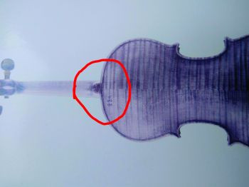 Violin of Soviet master Morozov (Морозов) 1933, №12. In the back of the violin you can see the mark "23A" and another one. And near the fingerboard when you're playing pizzicato your finger may touch it, so I have some place there with no lacquer.