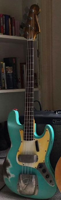 60’s Jazz Bass, turquoise finish. Yellow pickguard. Very worn/relic’d, thumb rest and ashtray bridge. Super recognisable bass.