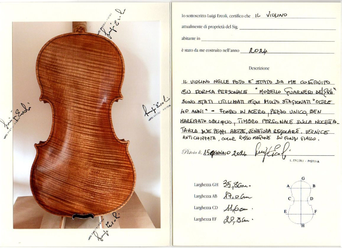 Violin by Maestro Luigi Ercoli, made in Pistoia in 2024. Excellent condition, no repairs or cracks. Excellent tone, full of harmonics, great sound with excellent projection in a large room, suitable for professional musicians and soloists. Beautiful craftsmanship, antique varnish. Certificate from the maker. Good price, excellent investment, much higher value. Guarantee. Hear the sound Ercoli. https://youtube.com/shorts/24o7FVWMvcM?si=940QTrvJnwTPQ7E9