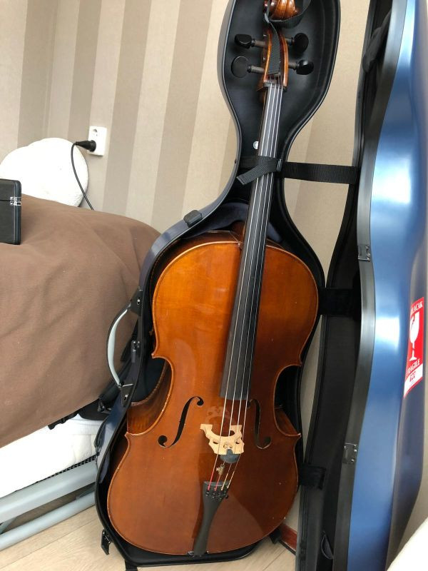 4/4 cello with solid dark brown varnish, ebony garnish, light use, 2 cm flat crack in side wall next to end pin.