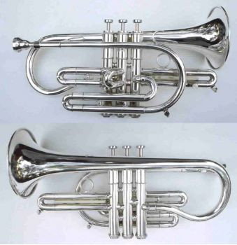 Getzen Eterna Cornet, silver lacquer, serial no EC2359. Slightly dented. When it was lost it was in a brown leather case