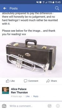 Yamaha Xeno European, silver plated. Serial number unknown. Small scratches and dents in curve of leadpipe underneath the mouthpiece. Tarnish in the numbers on the valves. Slightly worn down mother-of-pearl valve tops. Dried moisture drops on flare of bell. Last seen in black hardcase with gold locks and a wide strap attached, containing the trumpet and two mouthpieces, one of which was a Vincent Bach 1 1/4 C. Case also containing white gloves, greying blue polish cloth, lead pipe brush, mouthpiece brush, some contact lenses, and a gold Sutton Music Service medal. Picture screenshotted from an earlier plea!